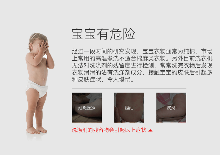 衣物滑滑的沾有洗涤剂成分,接触宝宝的皮肤后引起多