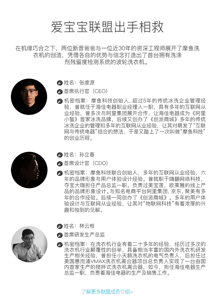 在机缘巧合之下,两位新晋爸爸与一位近30年的资深工程师展开了摩鱼洗衣机的创造,凭借各自的优势与信念打造出了首台拥有洗涤剂残留度检测系统的波轮洗衣机。